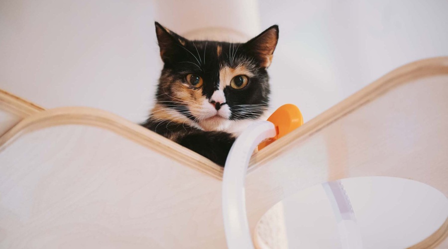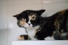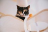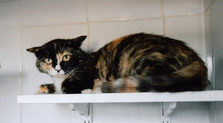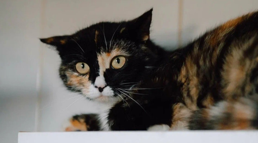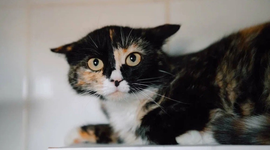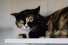 Клюква - молодая кошка с ярким трёхцветным окрасом и выразительными янтарными глазами.